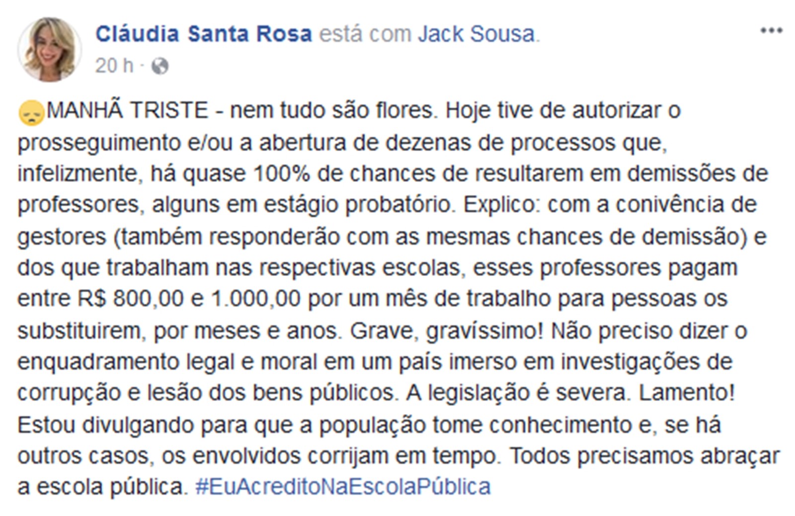 Secretaria de Educação do Rio Grande do Norte abriu processos que podem levar à demissão dezenas de professores da rede pública de ensino. A informação foi divulgada pela própria titular da pasta, Cláudia Santa Rosa. Em uma rede social, na noite desta sexta (12), ela disse que há casos de professores que estão pagando de R$ 800 até R$ 1.000 por mês de trabalho para que outras pessoas os substituam. "Grave, gravíssimo!", ressaltou.